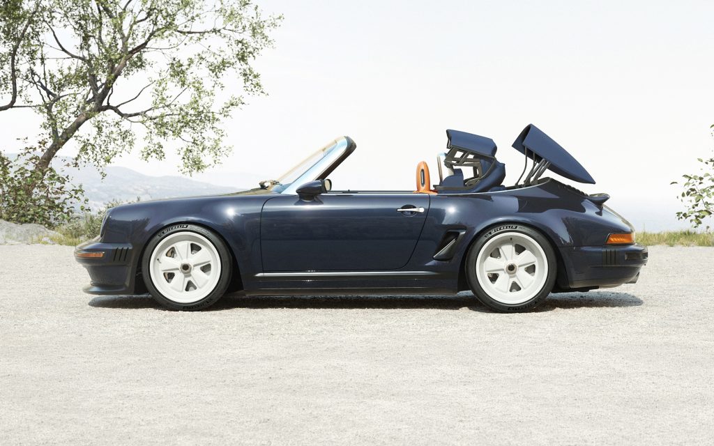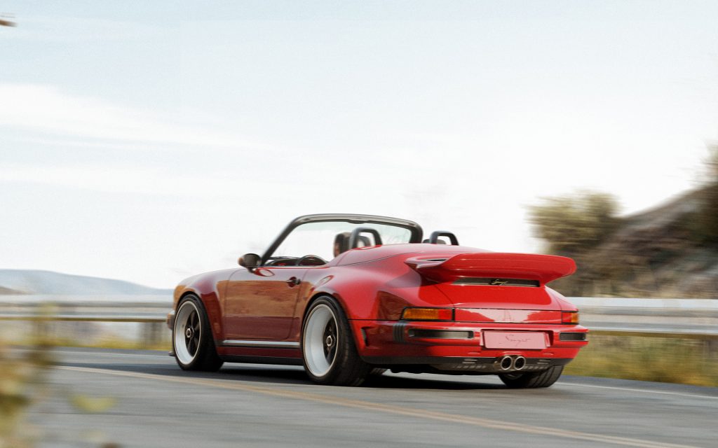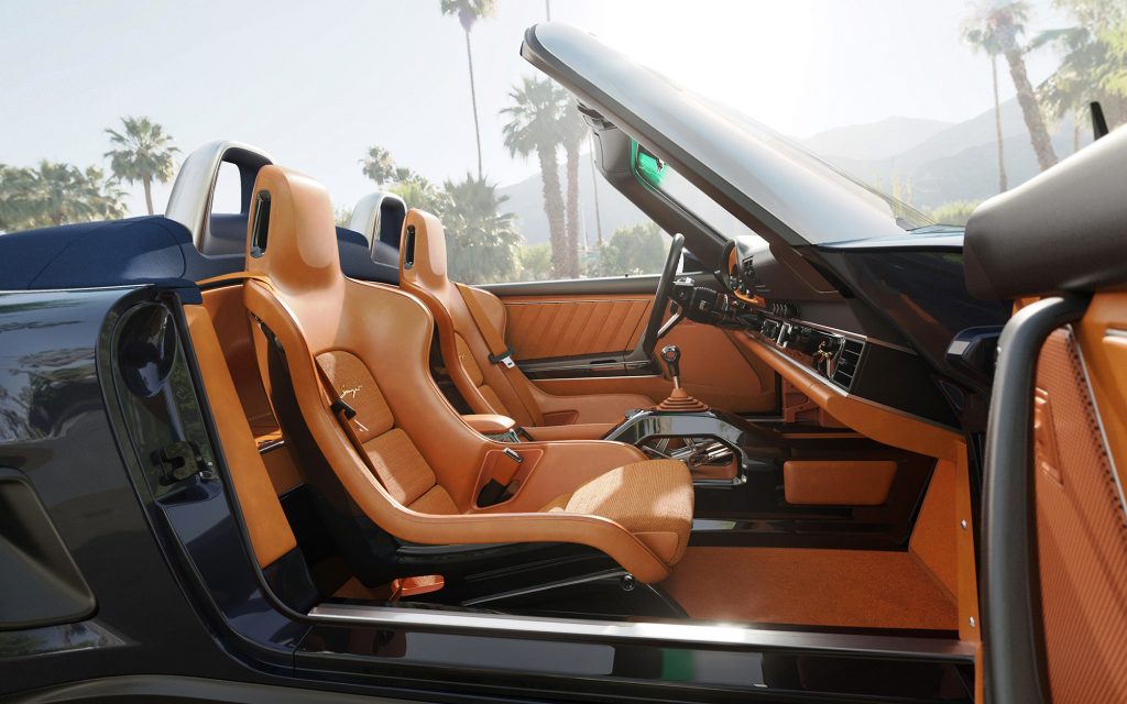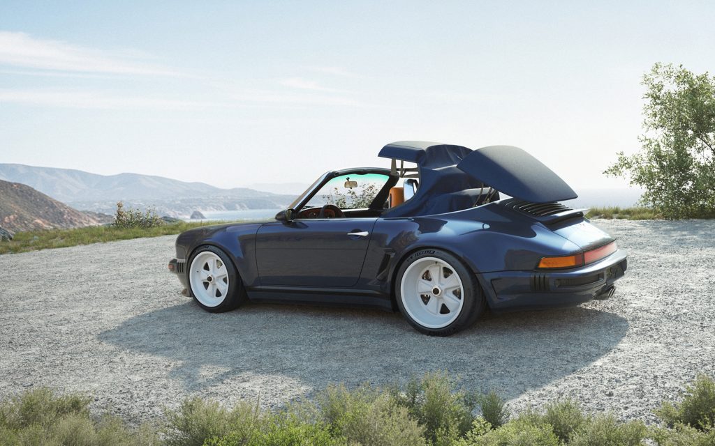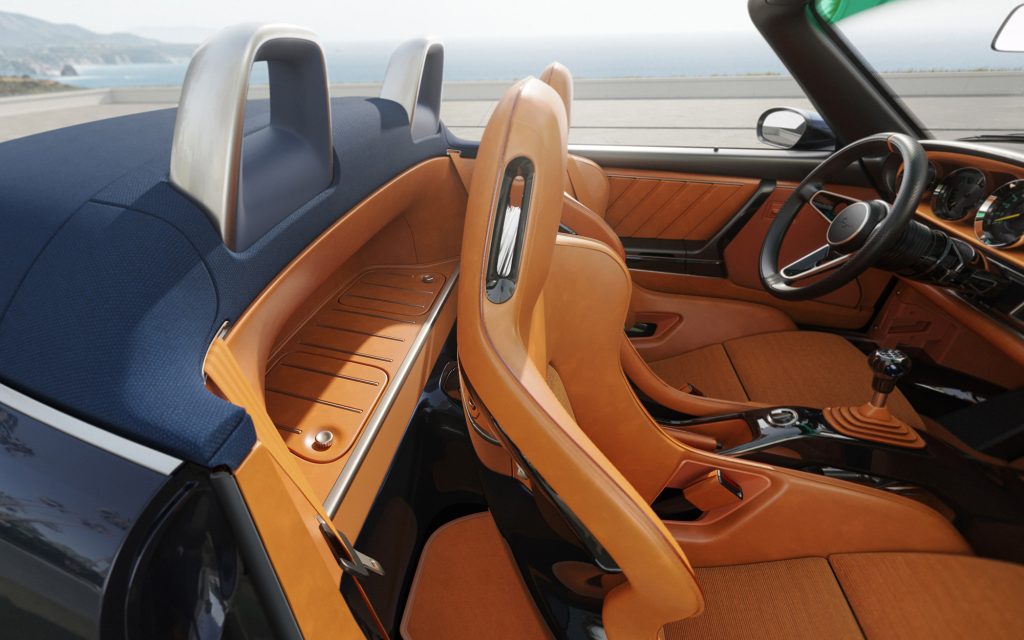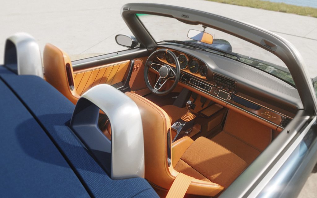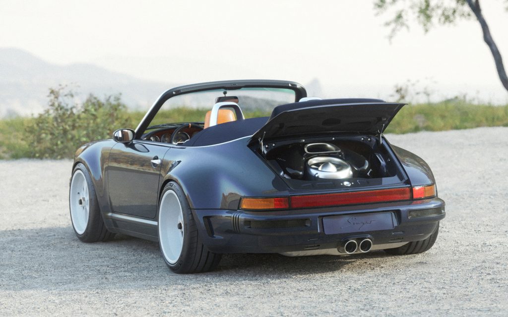 A newly developed lightweight “Z pattern” folding roof mechanism replaces the period system. Singer states that the revised design reduces mass and maintains a clean silhouette whether raised or lowered. Buyers may specify either a fixed rear wing or a speed-activated unit, echoing period configurations that could be ordered with or without the whale tail spoiler.