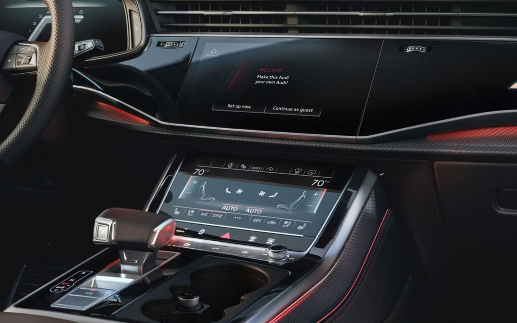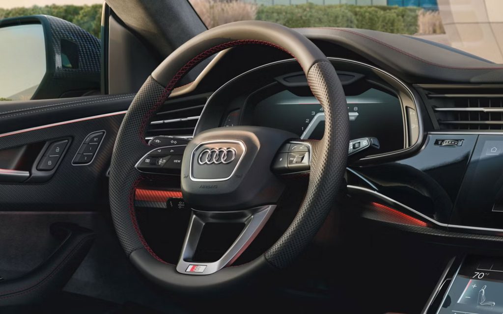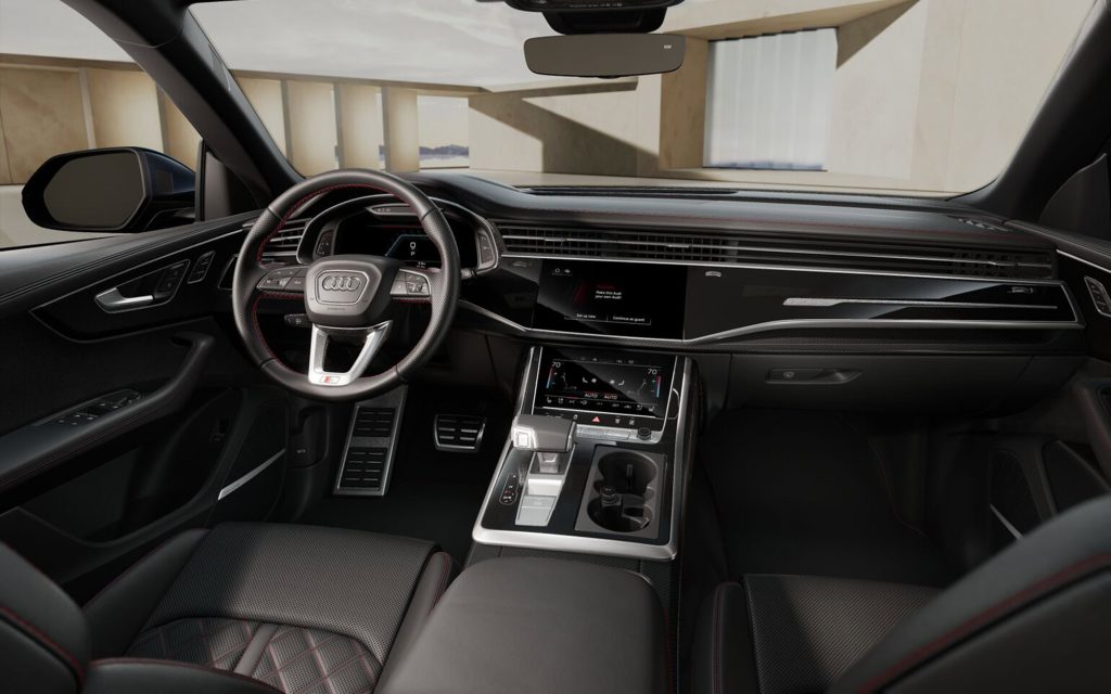 For the Q8, the Sport plus package adds $7,600 to the base price and brings a comprehensive mix of performance and visual upgrades. Key highlights include sport adaptive air suspension, 23-inch 10-spoke trapezoid wheels with summer tires, and S line exterior styling paired with black optic trim. Inside, the cabin receives SQ8-style sport seats plus with ventilation and massage functions, Crimson Red contrast stitching and seat belts, and an extended leather package accented by carbon twill matte inlays. Exterior details such as anthracite Audi rings, dark chrome exhaust tips, and red brake calipers complete the package. For those seeking a little more edge, a separate Carbon Package ($2,000) adds carbon fiber mirror housings, taillight trim, and side sill inlays.