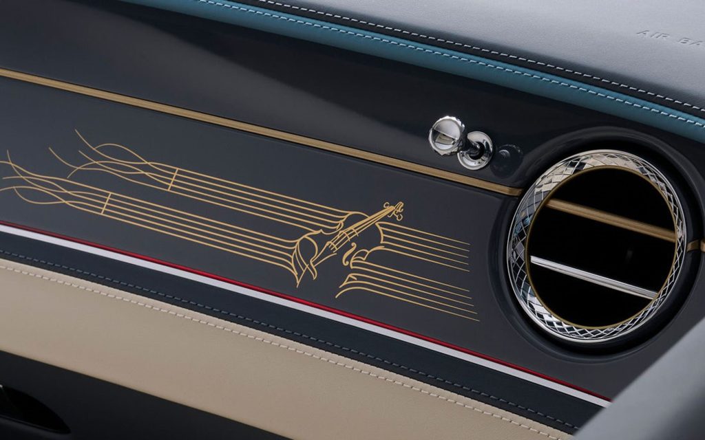 Inside, the craftsmanship reaches orchestral levels. The passenger fascia features a golden violin motif integrated into a musical stave — a nod to the Athenaeum’s legacy of great performances and its role as home to the George Enescu Philharmonic Orchestra. The headrests are embossed with the concert hall’s emblem, while illuminated welcome lamps project its intricate silhouette onto the ground. Custom tread plates further commemorate the collaboration between Bentley Bucharest and the Mulliner design team.