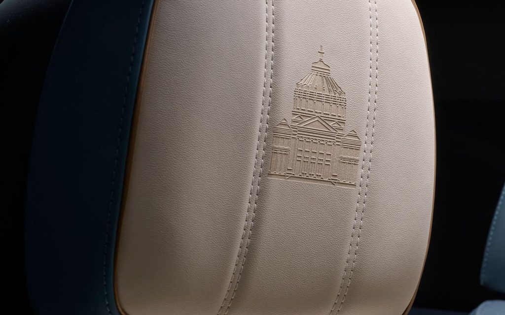 The interior color palette draws directly from the Athenaeum’s décor, combining Brunel, Linen, and Aegean Blue hides in a bespoke split complemented by Piano Brunel veneer. Together, the tones create a serene yet stately atmosphere worthy of both concert hall and coachbuilder.