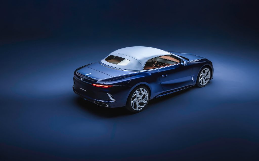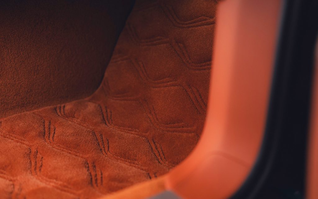 Inside, the cabin trades drama for warmth. Autumnal tans and caramel tones are offset by soft blue accents that echo the exterior Breslow Blue, visually pulling the Airbridge color into the interior architecture. Contrast stitching flows seamlessly from tonneau to seats, headrests, and instrument panel. Look closer still and you’ll find the outline of Mount Batur—the car’s namesake—quietly worked into the deep-pile floor mats, a detail that rewards attention rather than demands it.