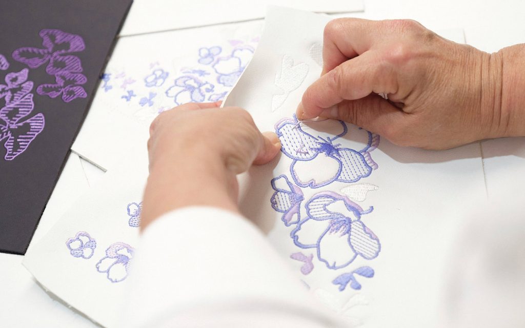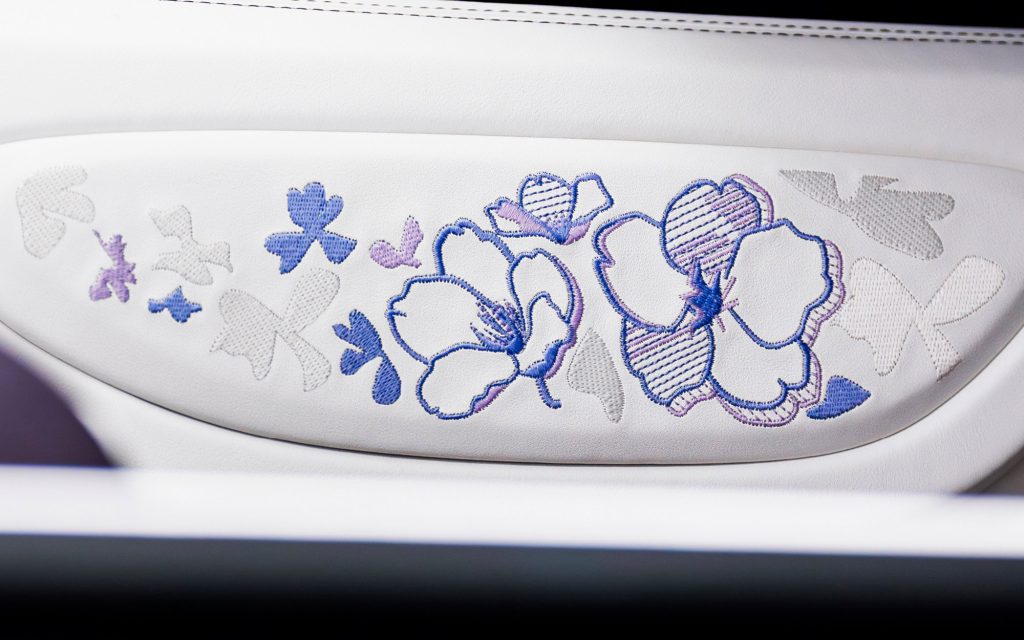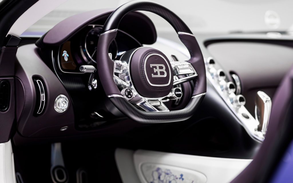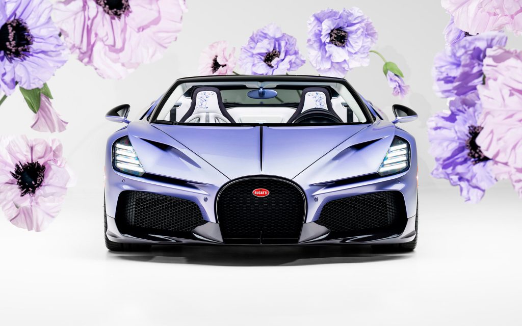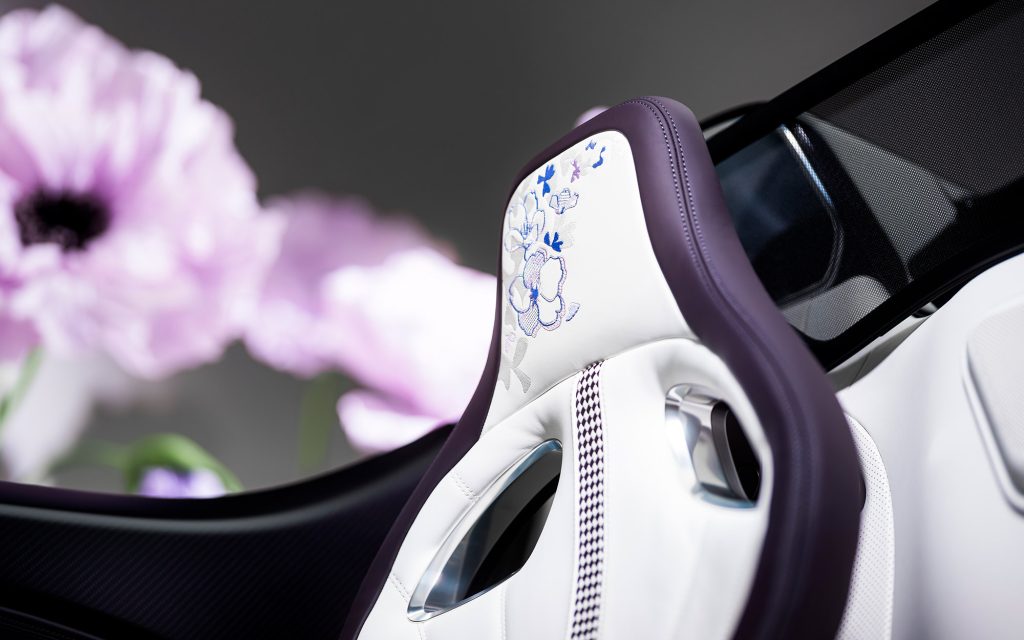 Inside, the theme continues through material and craftsmanship. A mix of Blanc and Minuit leather is paired with violet accents and carbon finishes, while intricate embroidery carries the floral motif across the cabin. Each headrest features hand-stitched designs composed of thousands of threads, engineered to create depth and tonal variation. Door panels extend the concept further, with flowing petal patterns designed to evoke motion—aligning even decorative elements with Bugatti’s core philosophy of dynamic form.