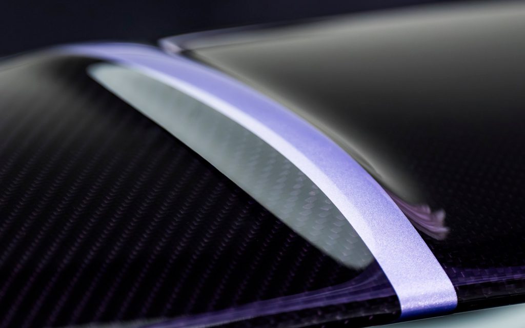 The result is a car defined by subtlety rather than spectacle. Its exterior is finished in a bespoke “Lavender” paint, developed through extensive sampling to achieve a balance of warmth, luminosity and tonal complexity. Depending on lighting conditions, the surface shifts between bluish and reddish violet hues, emphasizing the sculptural form of the Mistral. Beneath this, exposed “Violet Carbon” provides contrast and depth, anchoring the otherwise ethereal color palette.