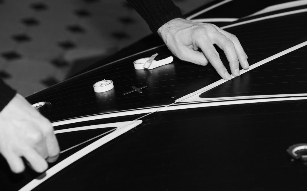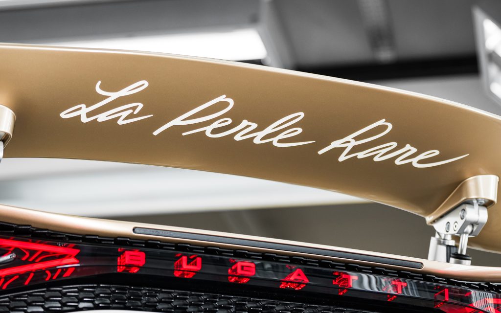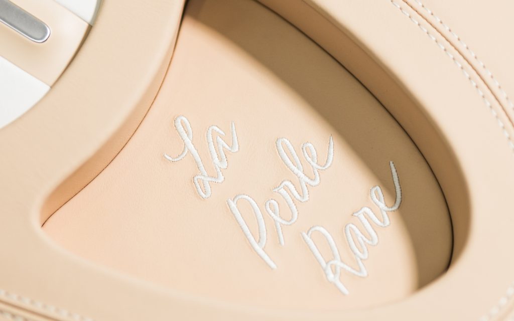 The name ‘La Perle Rare’ appears throughout the car, including stitched detailing and engravings on the bespoke engine cover. Straub’s handwritten signature is incorporated as part of the personalization, underscoring the collaborative aspect of the commission.