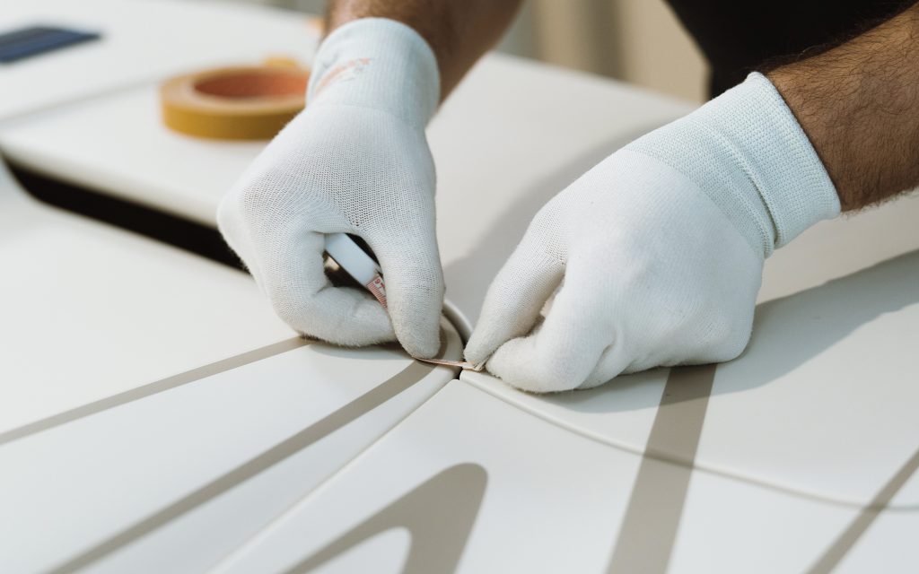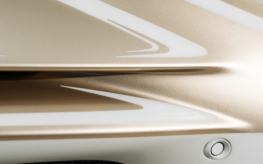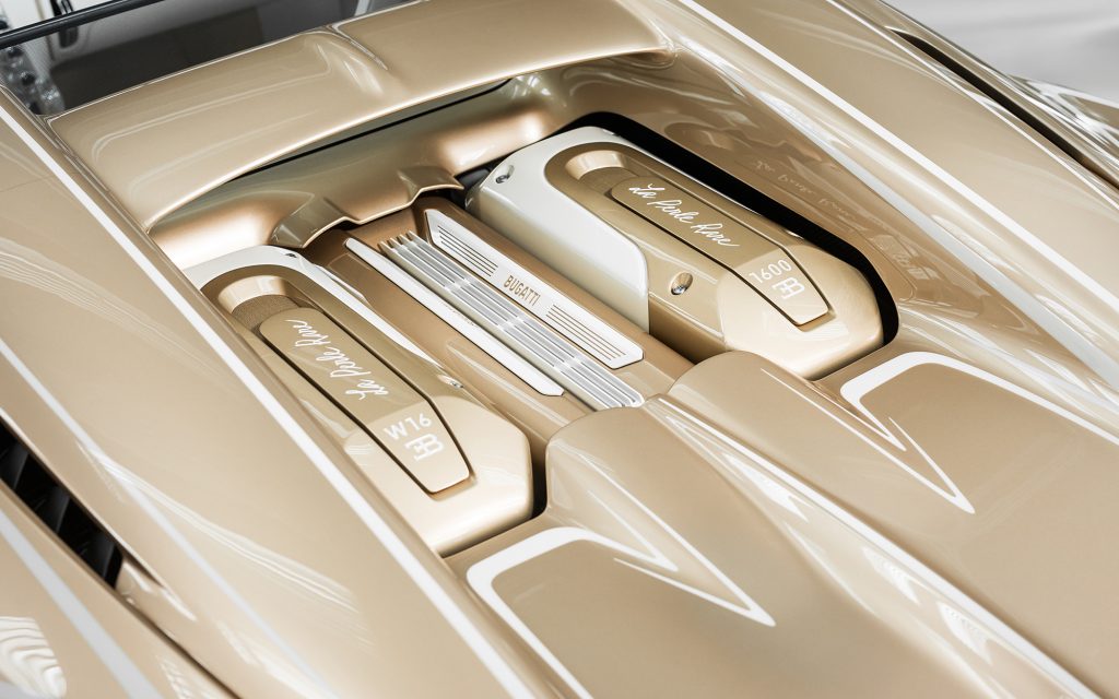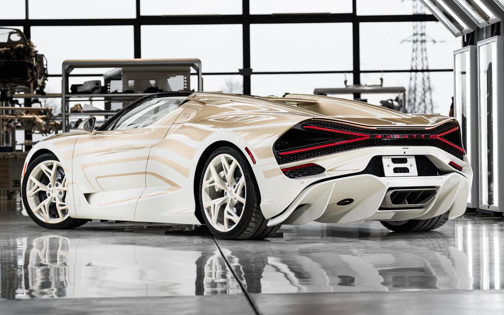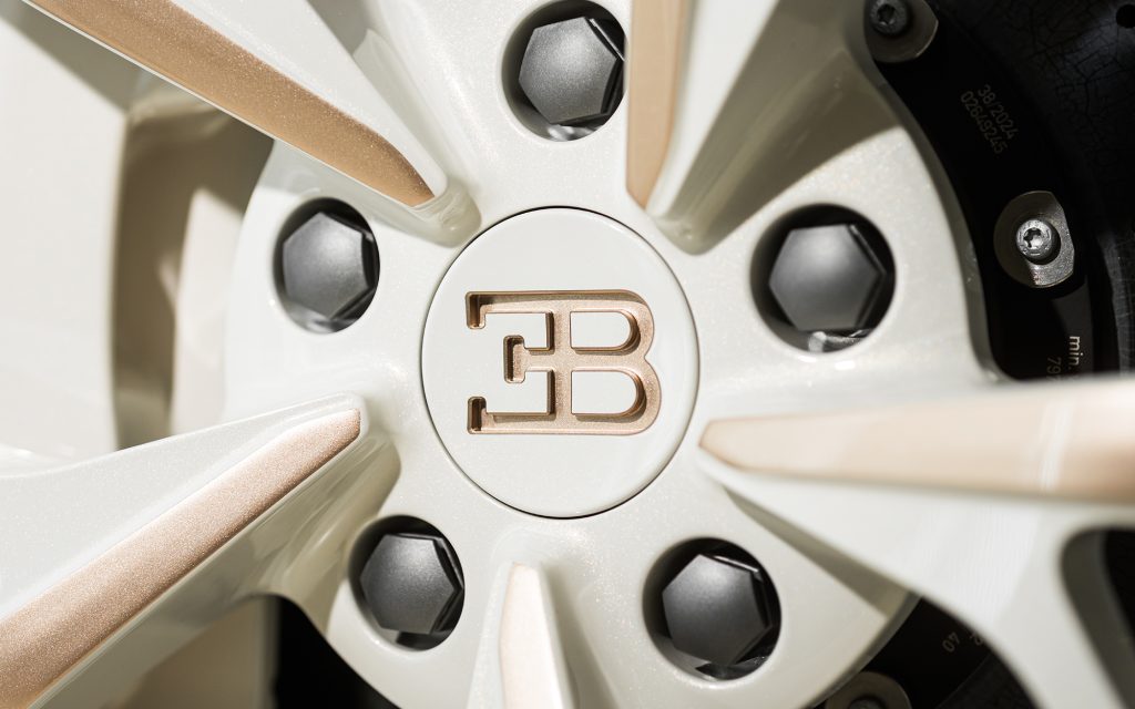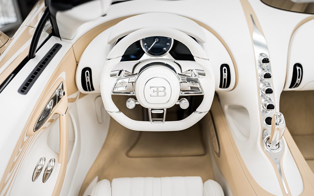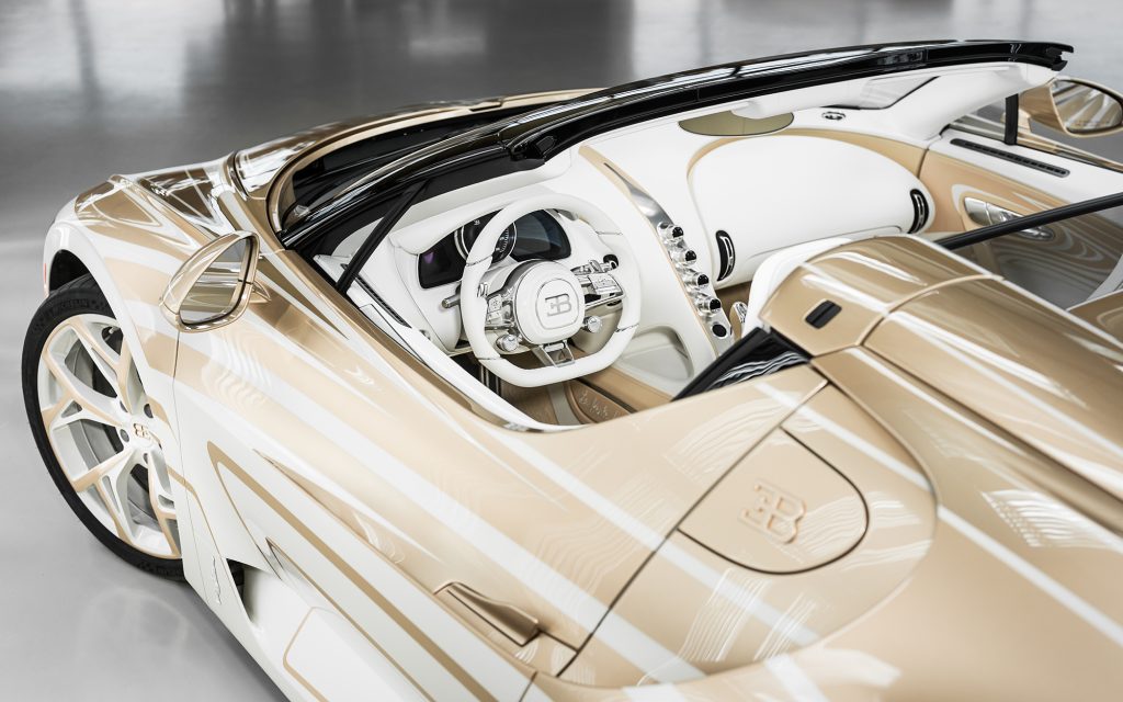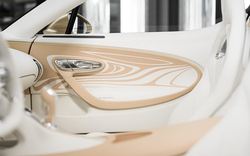 After exploring silver and various white tones, the team developed two entirely new colors: a warm, gold-infused hue for the upper body and a refined warm white for the lower sections. The separation line between the two is not a simple stripe. According to Bugatti, hundreds of hours were devoted to hand-taping, masking and painting the dividing lines to achieve precise visual balance.