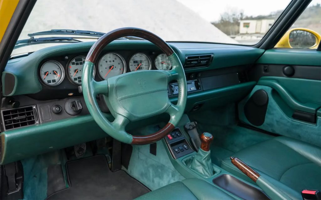Delivered new on March 27, 1997 through Porsche Cologne in Germany, this Carrera S wears Speed Yellow (L12G)over an unusually specified Nephrite Green leather interior, a combination that wasn’t uncommon in German cars of the 1970s though is nearly impossible to find in cars from the 90s. Inside, the unusual palette is complemented by Walnut Burl trim from Porsche Exclusive, creating a cabin that feels more like a bespoke commission than a typical late-1990s sports coupe.