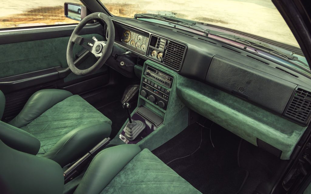 If the exterior challenges expectations, the interior quietly reinforces the Delta Integrale’s factory specifications. While purple never really appeared on Integrale order sheets, green interior trim did exist in-period, particularly in Alcantara, making it was one of those period details that feels surprising today despite being historically plausible. Perhaps some Lancia strategist had Alitalia-themed special editions dancing in their heads.