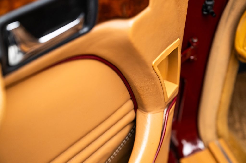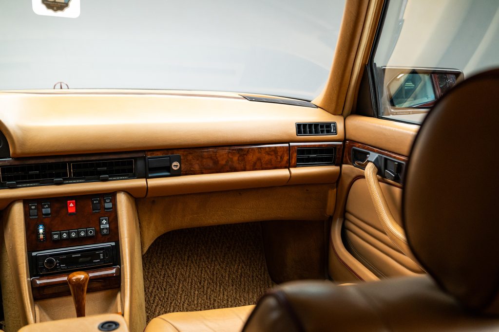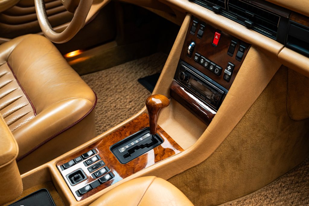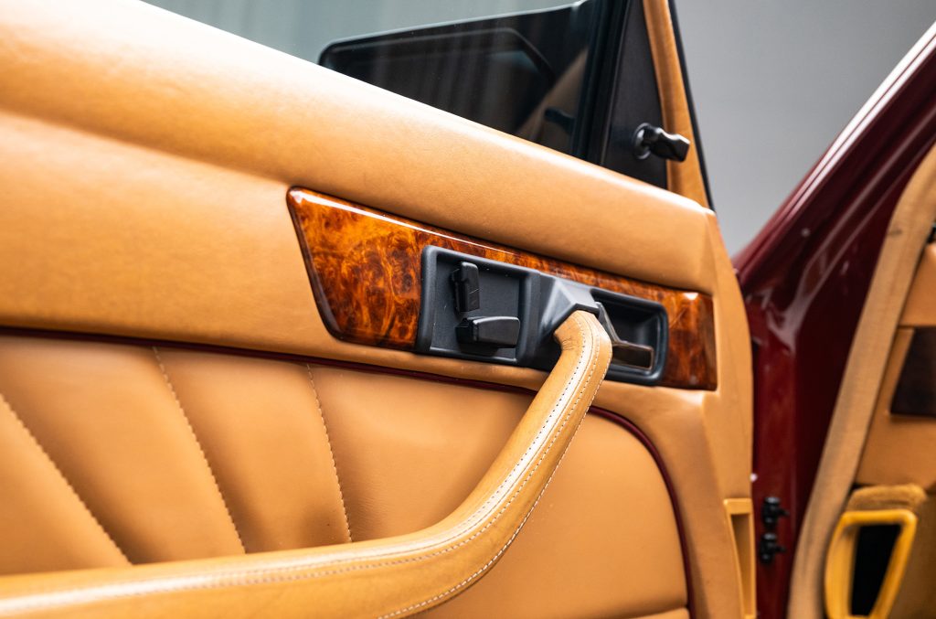Inside, the contrast was deliberate and theatrical. AMG partner Gemballa retrimmed the cabin in palomino leather, extended across seats, door panels and much of the lower dashboard. Red piping and contrast stitching echoed the exterior color, while bespoke door cards and rear compartment details elevated the interior beyond anything available from Mercedes-Benz at the time. The effect was pure 1980s high style—warm, rich and unapologetically custom.