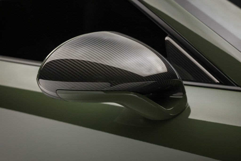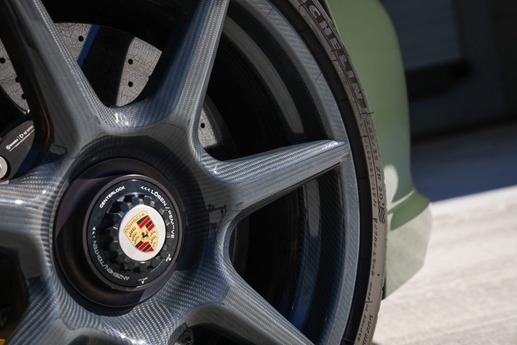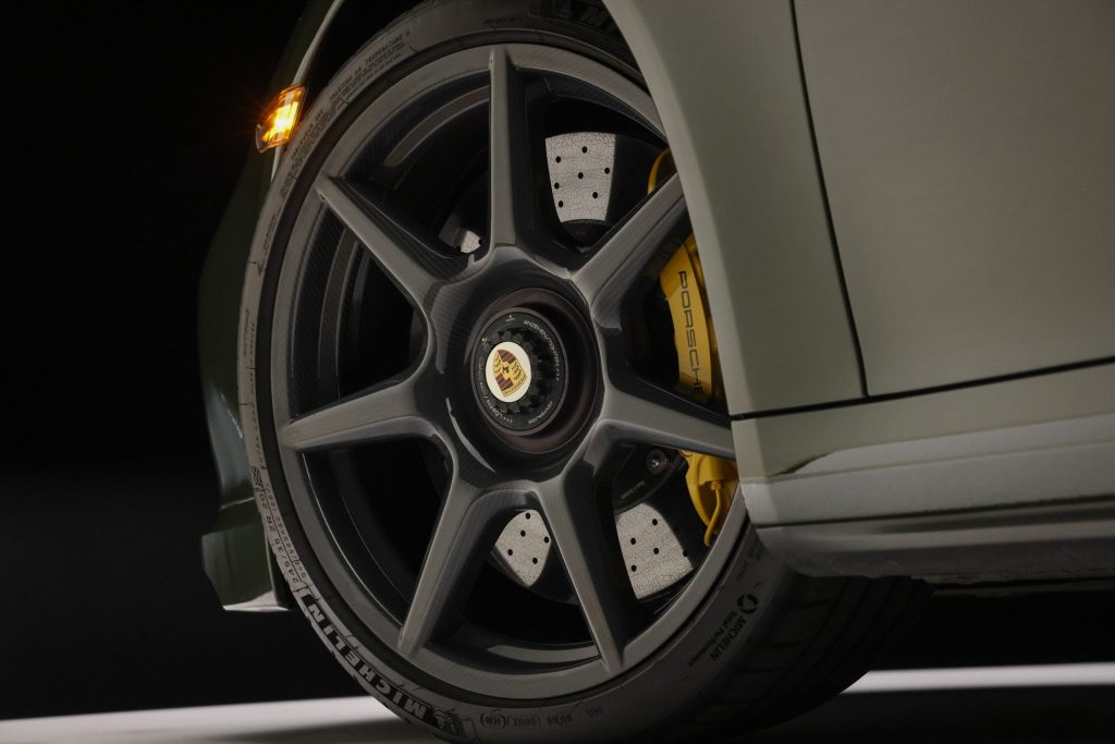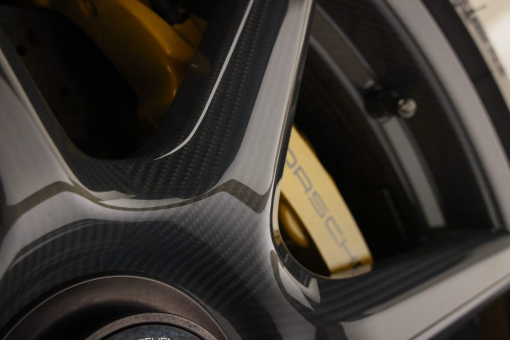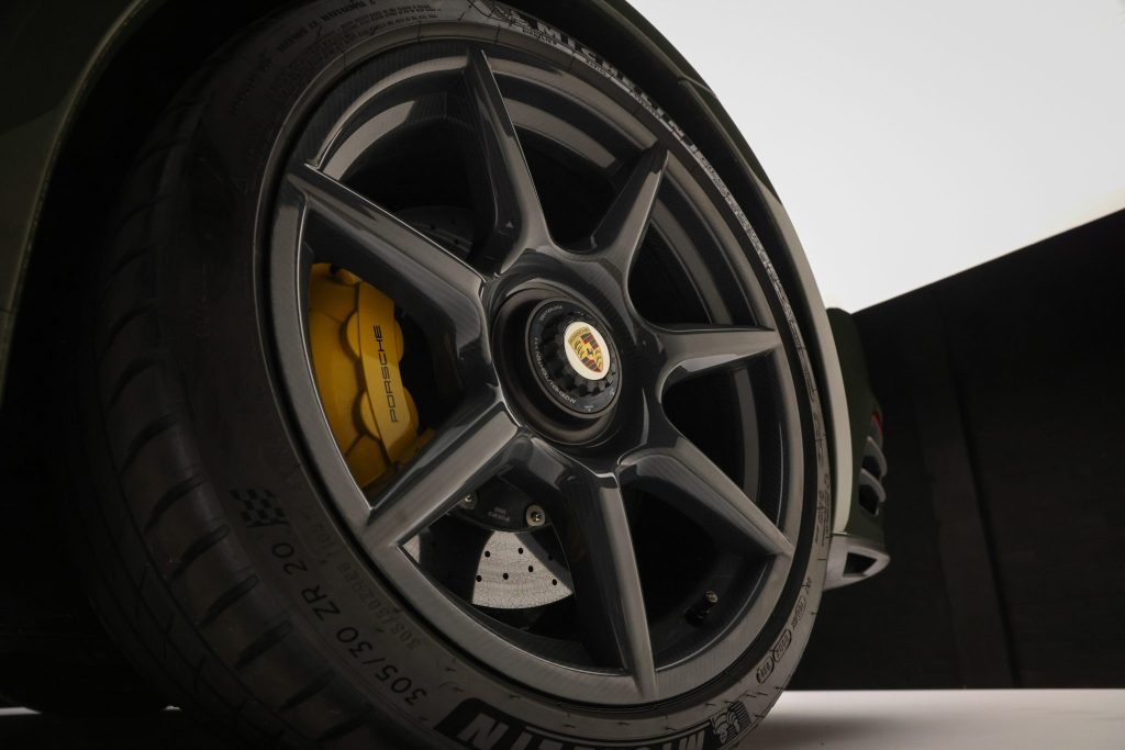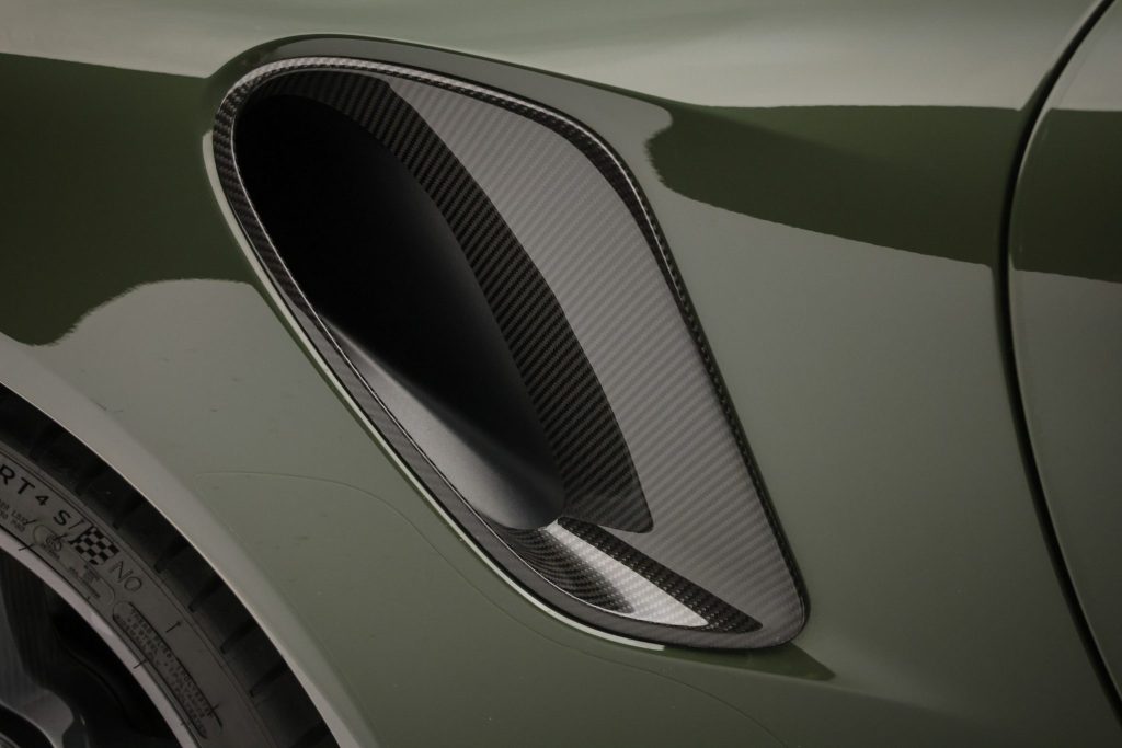 This particular example wears paint-to-sample Black Olive — a nuanced non-metallic finish that isn’t commonly seen on these cars, making it unusually striking in photos and on the road. The car is well-equipped with Porsche Ceramic Composite Brakes, carbon-fiber Exclusive Manufaktur center-lock wheels, and the Sport Chrono Package, enhancing both stopping power and dynamic capability. A carbon-fiber exterior trim package, heated power-adjustable sport seats, Burmester audio, and a sunroof add practicality and comfort for daily use or toy status.