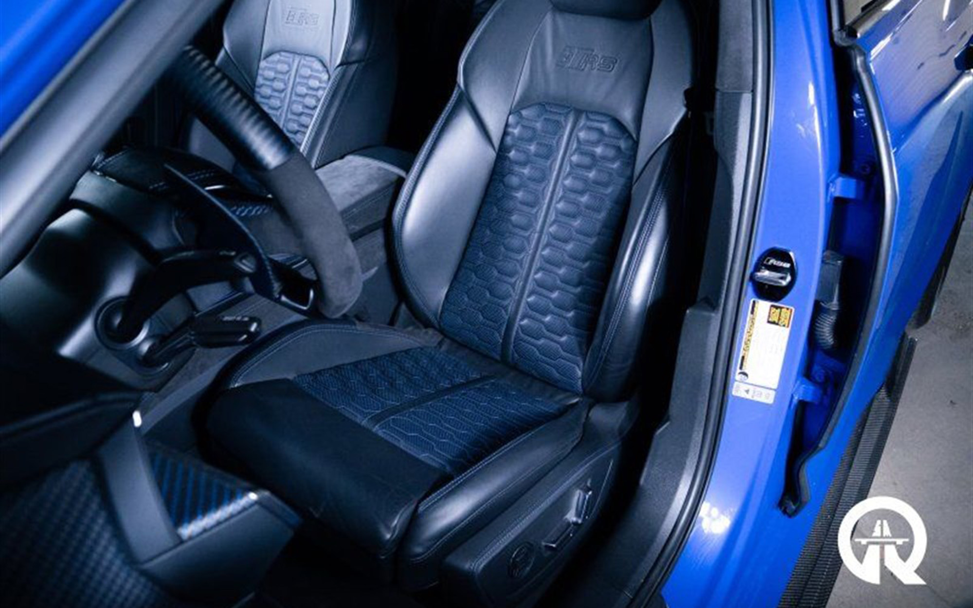 Inside, the transformation is more defined. A full European-market 25RS interior conversion has been executed to factory standard, including seat upholstery, Alcantara trim, and model-specific details like puddle lamps and badging. Blue carbon accents, an Alcantara headliner, and an AskCarbon steering complete the mix.