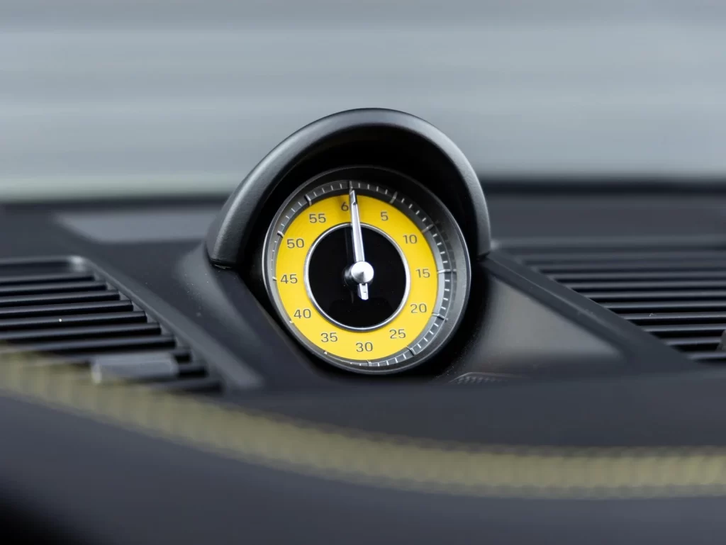 The interior is equipped with Ventilated Front Seats, the Storage Package, and a Deviated Stitching Interior Package in Racing Yellow extending across the dashboard, door panels, center console lid, knee pads, and rear side panels. Driver-focused details include a central tachometer in Racing Yellow, Sport Chrono stopwatch dial in Racing Yellow, seat belts in Racing Yellow, a heated GT Sport steering wheel with matte carbon fiber trim, PDK gear selector in aluminum, and aluminum pedals and footrest. Additional trim elements include Sport Seats Plus backrest shells in leather with matte carbon fiber inlay, illuminated matte carbon fiber door sill guards, sun visors in leather, and a leather steering column casing. Audio is provided by a Burmester High-End Surround Sound System.
