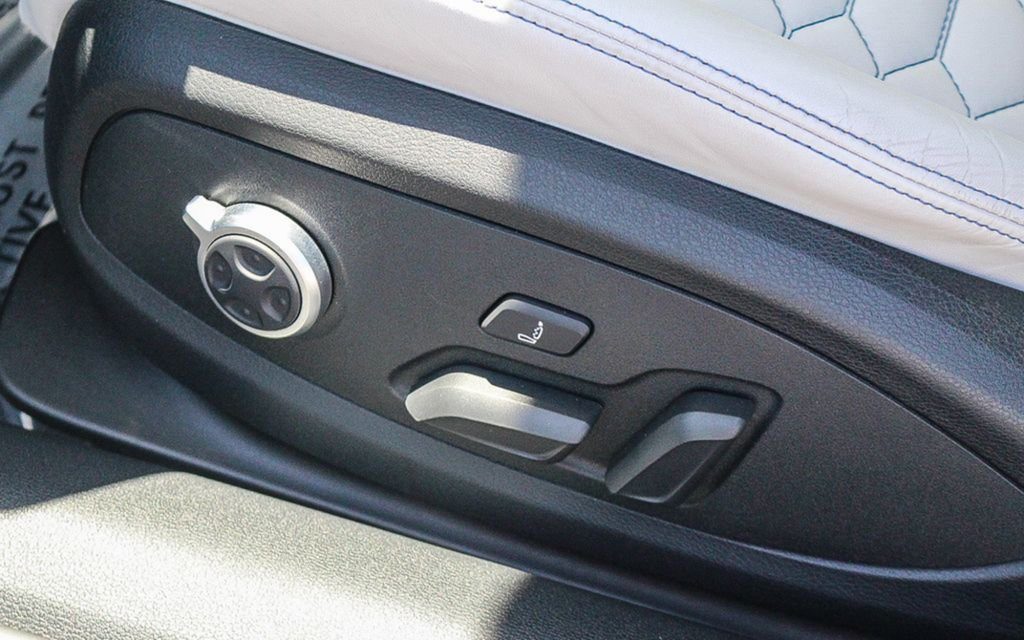 It goes further. Inside, the car has a very light leather – grey bordering on white, and with blue accent stitching, blue leather on the center console side panels and blue Alcantara on the door cards.