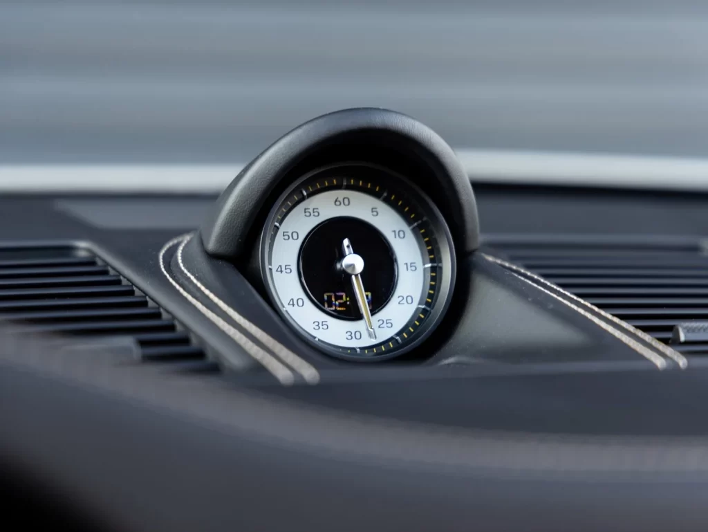 Exterior equipment includes a carbon fiber roof, model designation on the doors in black, carbon fiber exterior mirror upper trims, an exclusive design fuel cap, LED headlights in black with Porsche Dynamic Light System, wheels painted in satin black, and exclusive design taillights. The car is fitted with a Front Axle Lift System and an Extended Range Fuel Tank (23.7 gallons). Porsche Ceramic Composite Brakes (PCCB) with high-gloss black calipers provide stopping power.