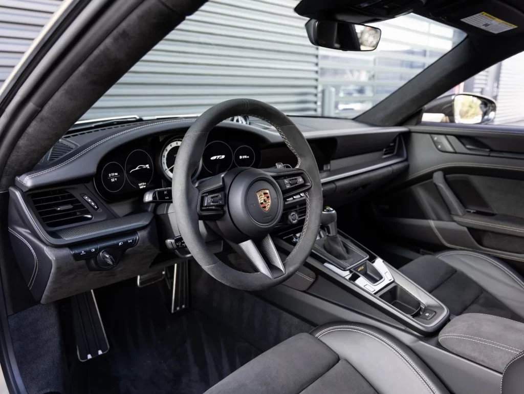 Standard performance features for the 911 GT3 platform represented here include rear-wheel drive, a high-revving naturally aspirated engine, and a chassis and aerodynamic package designed to balance road and track performance. The Extended Range Fuel Tank option increases capacity to 23.7 gallons versus the standard 16.9-gallon tank.