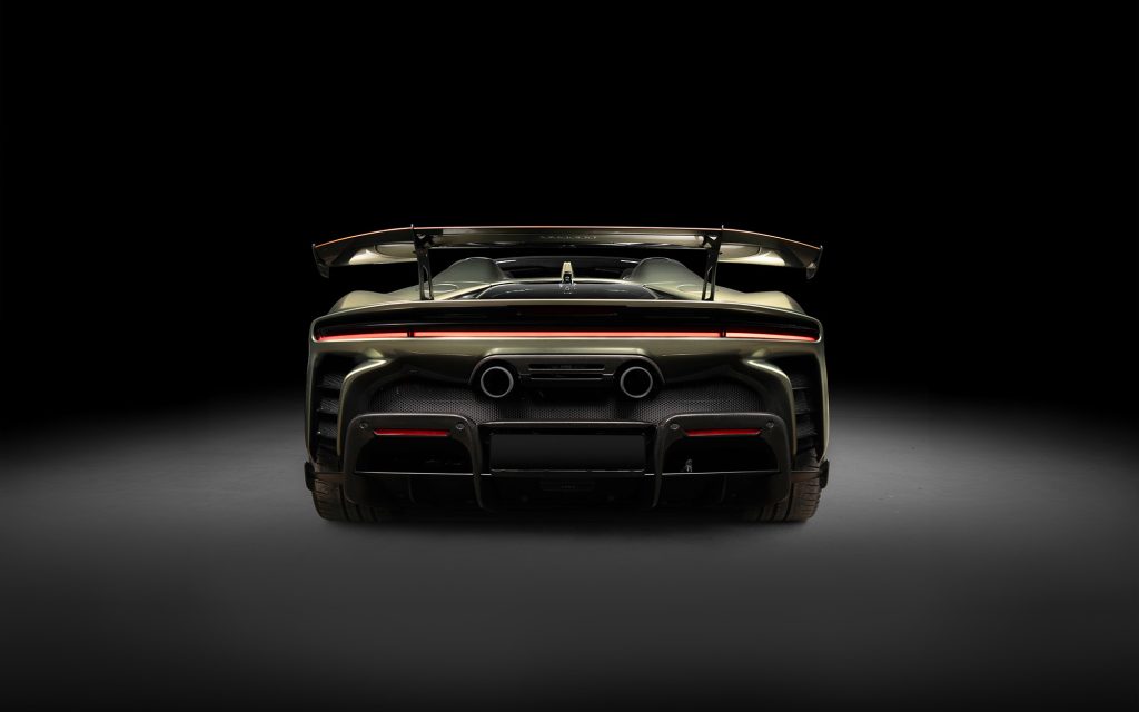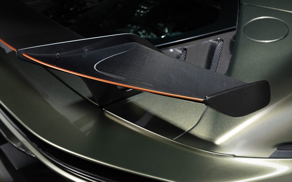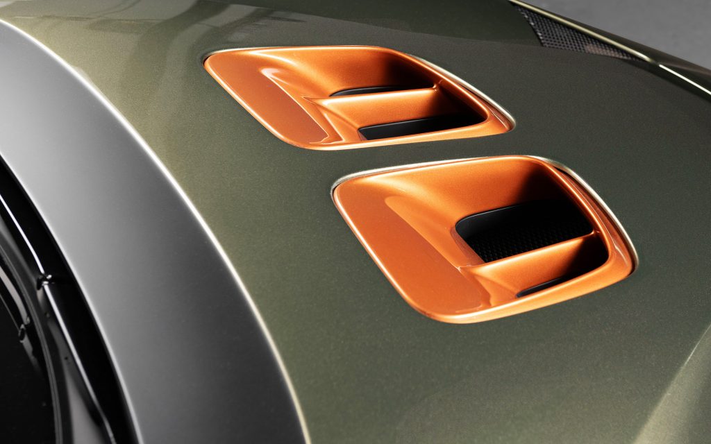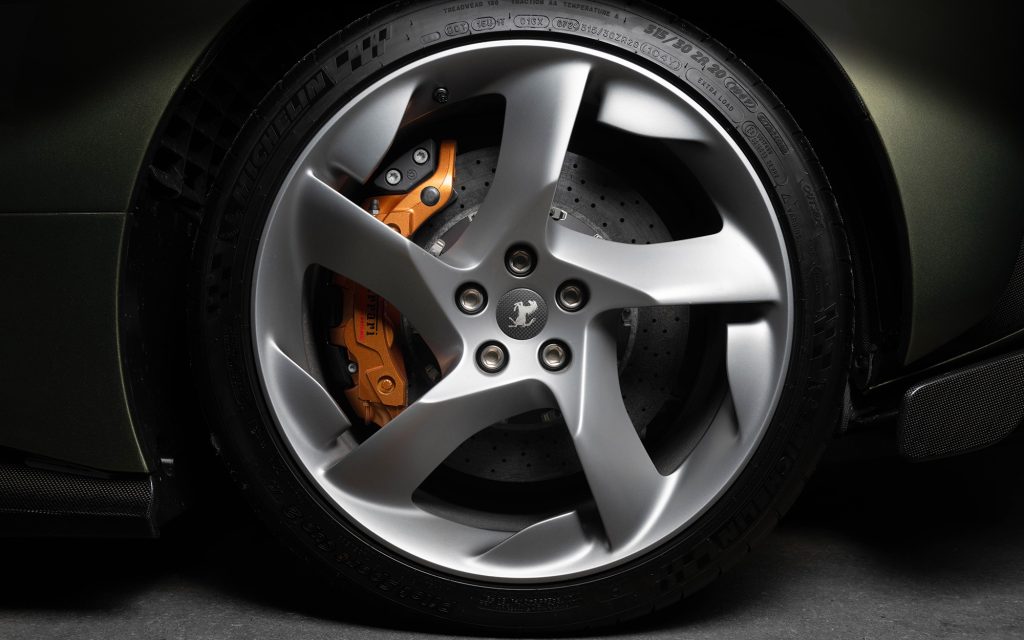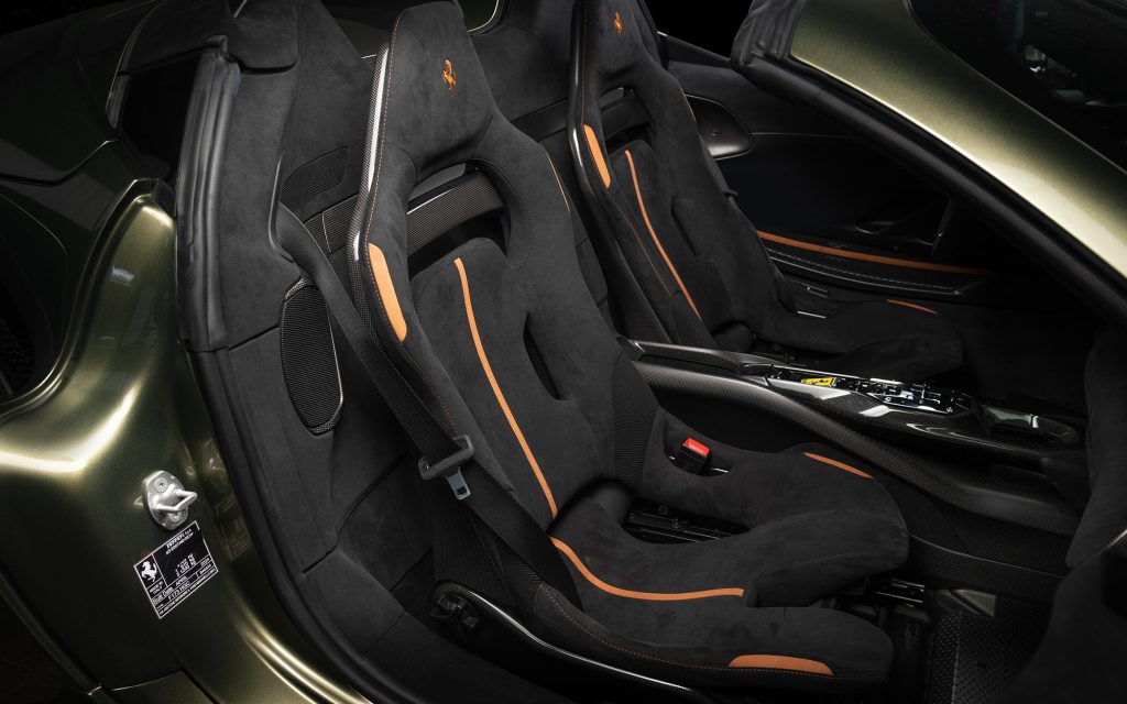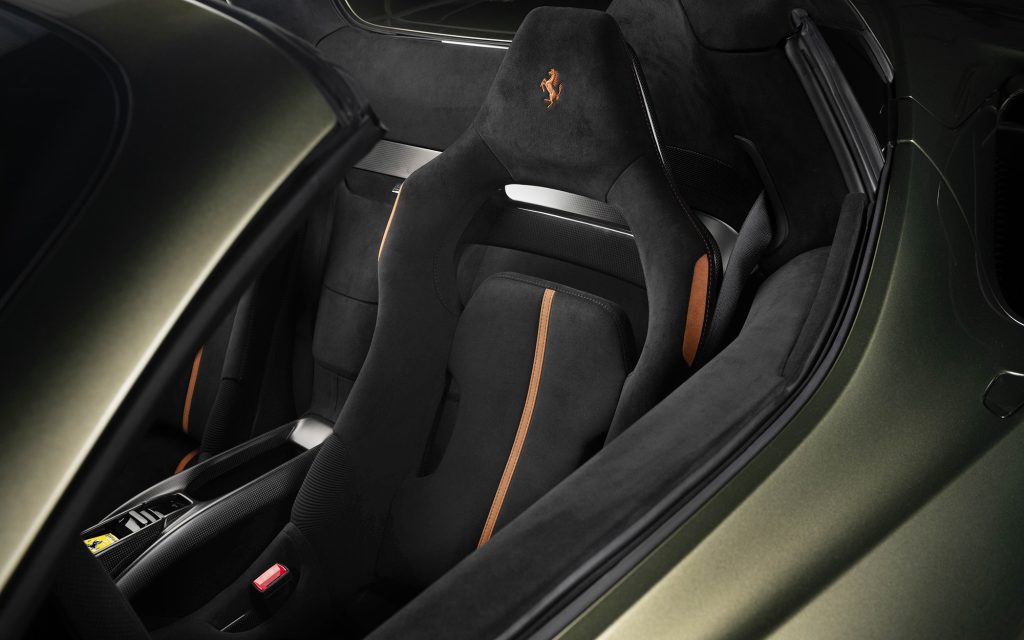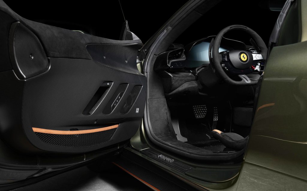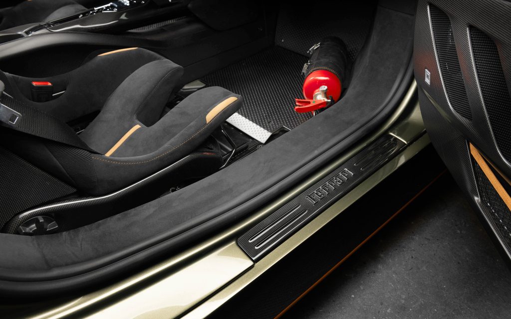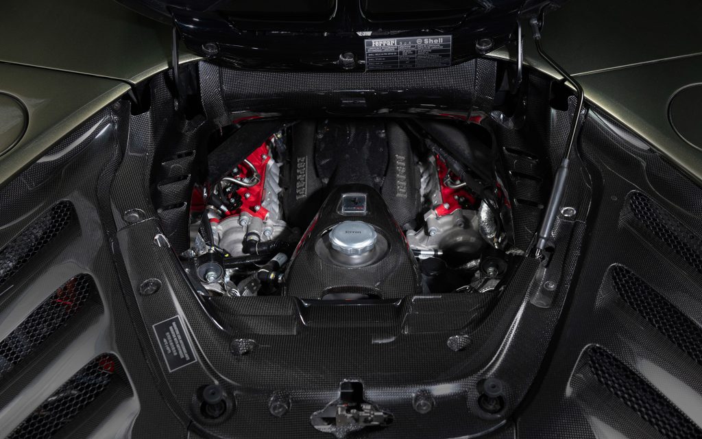 This example is finished in Extra Range Verde Masoni with Dark Amber Dreamlines and airbrushed Scuderia shields. Carbon-fiber elements include the front splitter, rear diffuser, side air splitters, engine cover, and wheel caps, with anti-stone film applied at the factory. The car rides on diamond-polished forged wheels with gold brake calipers.