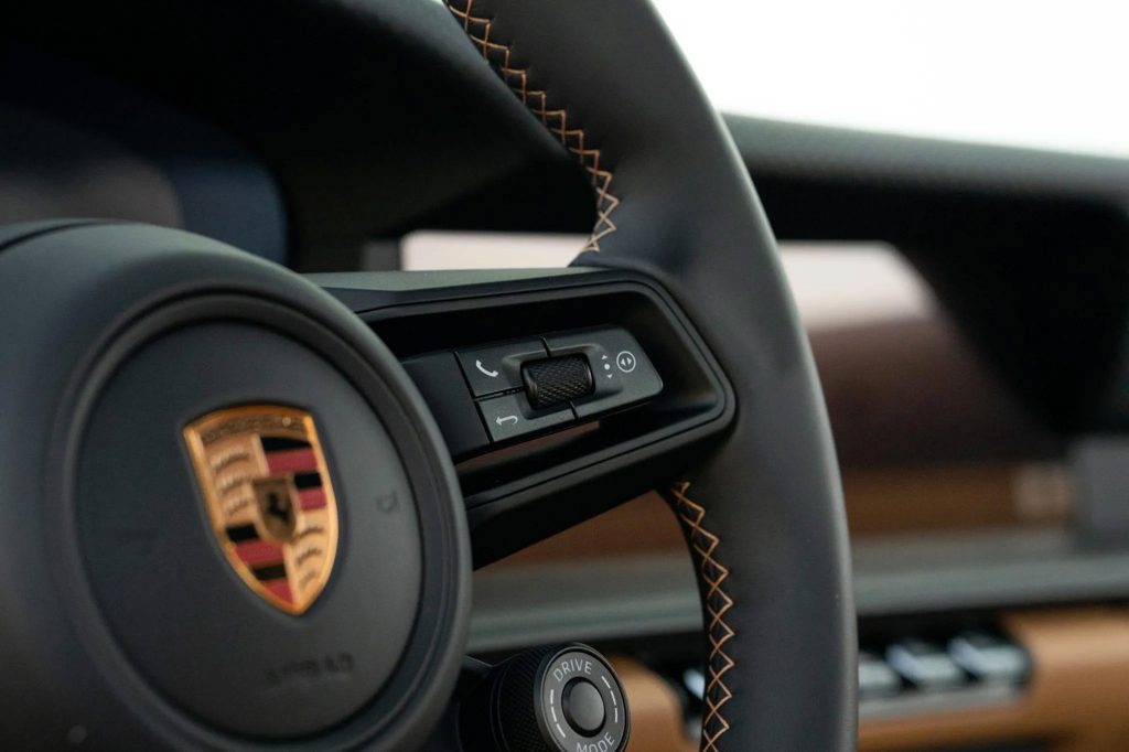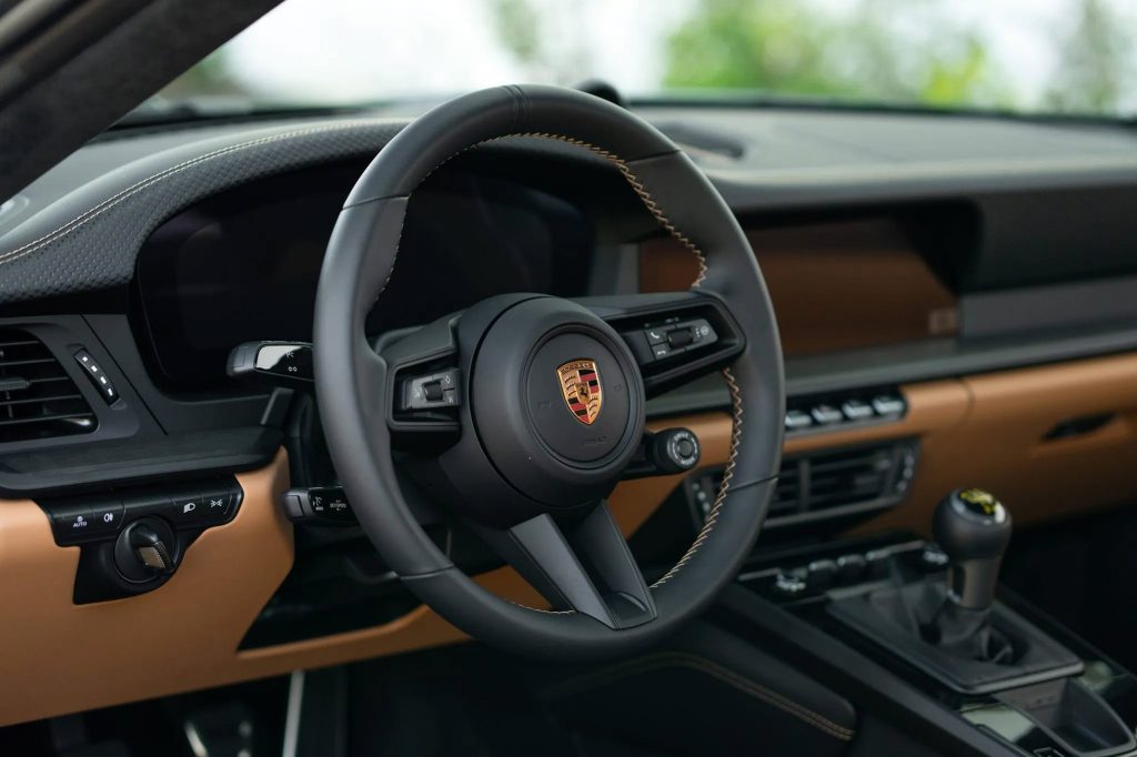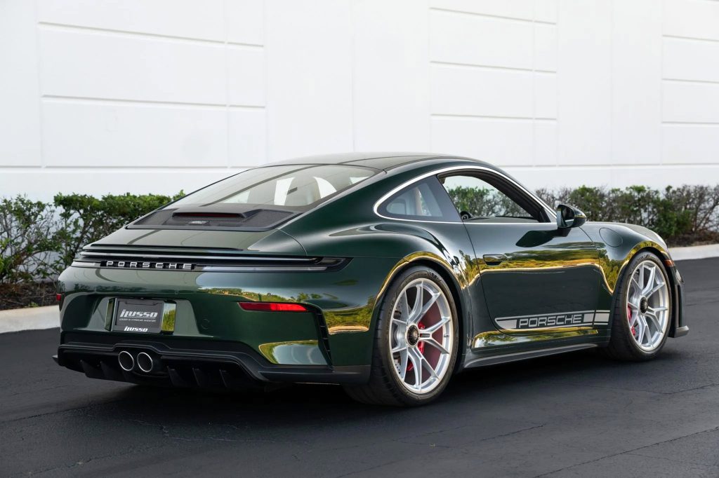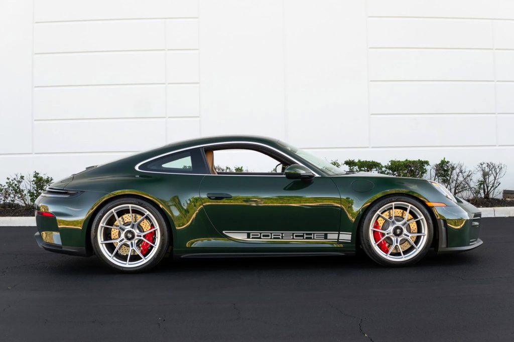 This example is equipped with a number of desirable options and finishes through Porsche Exclusive Manufaktur, including the Oak Green Metallic Neo paint and a classic brown leather interior. The combination references historic Porsche color pairings while aligning with current trends toward heritage-inspired specifications.