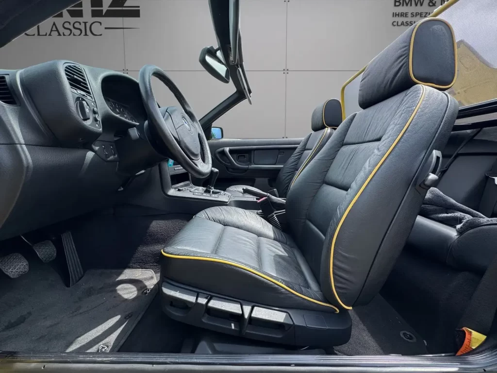 • Exclusive Edition specification with factory Sonderlack “Dakargelb” (special yellow paint) and Sonderleder (special leather interior) in black with yellow piped accents — a classic era-appropriate contrast that was rarely ordered at the time.