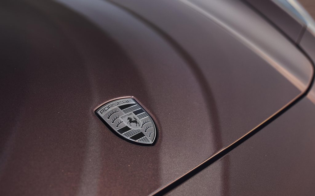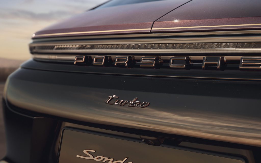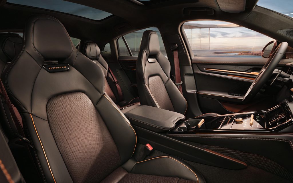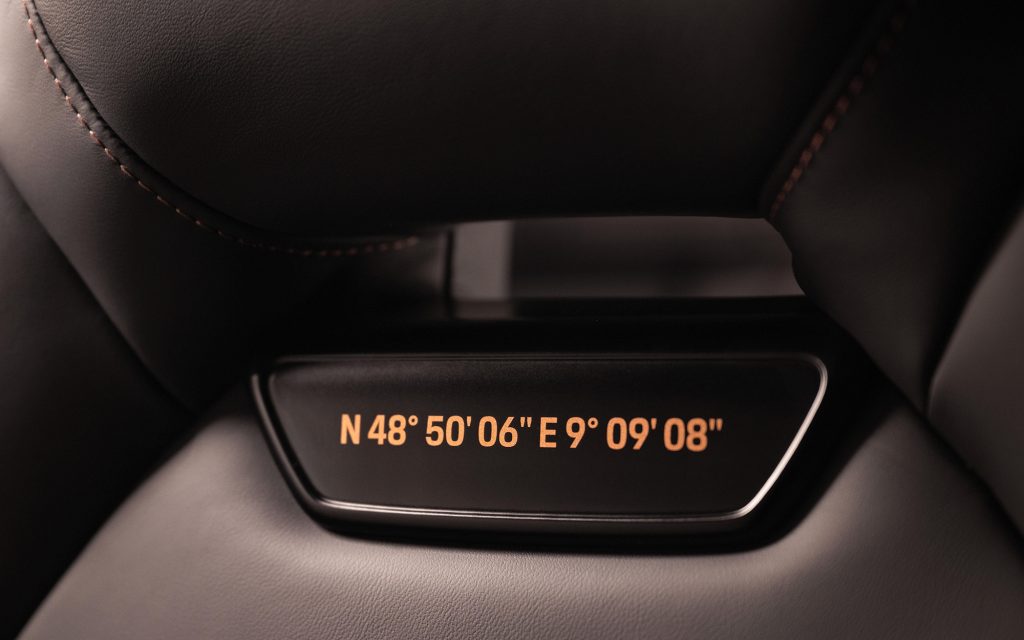 Material craft plays an equally central role. Black-stained chestnut wood appears on the door panels, while custom badges on the front seats display the geographical coordinates of Zuffenhausen and Leipzig—the two Porsche locations responsible for the Panamera’s development and production. Barrique Red seat belts add a subtle layer of contrast.