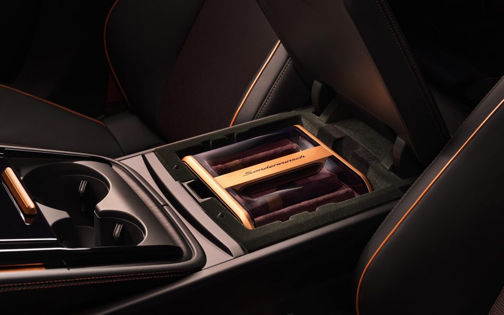 Beyond colour and trim, the Sonderwunsch team also explored how unusual luxury requests can be brought to life. Two conceptual features illustrate the program’s flexibility: a bespoke cigar humidor and a Champagne cooler. The humidor, housed within the centre-console compartment, uses cedarwood inserts and a hygrometer to maintain ideal humidity, with inserts designed to hold accessories such as a cutter and lighter. The illuminated Champagne cooler, integrated into the rear seating area, accommodates a small bottle and two glasses stored in the armrest. Both features are finished in Avium and carry Sonderwunsch branding.