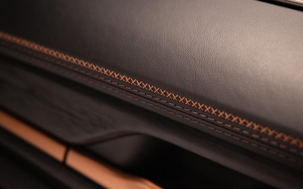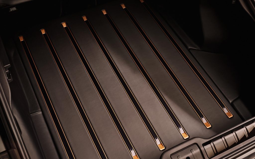 The luggage compartment receives the same degree of attention. Fully lined in leather, it features black anodised metal protection framed in Avium, along with a loading sill plate finished in black lacquer and embedded with real gold flakes. Illuminated door sills, a black leather key case with Avium stitching, and a matching charging cable bag complete the commission.