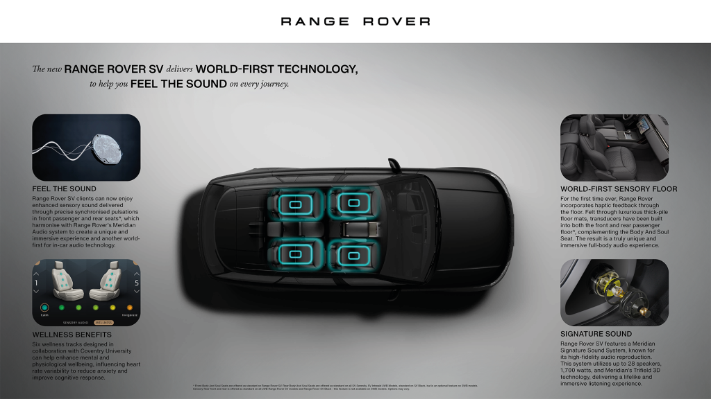 The SV Black also debuted Range Rover’s latest iteration of its audio-driven wellness technology. Rear Body and Soul Seats were fitted as standard, joined by a new Sensory Floor system that introduced haptic feedback through the floor mats in addition to the seats. The system allowed occupants to physically feel audio vibrations through multiple contact points, expanding the existing BASS technology beyond the seating surfaces alone. Sensory Floor is exclusive to Range Rover SV models and was standard on the SV Black shown in Miami.