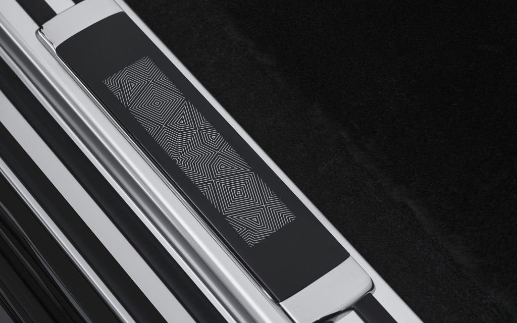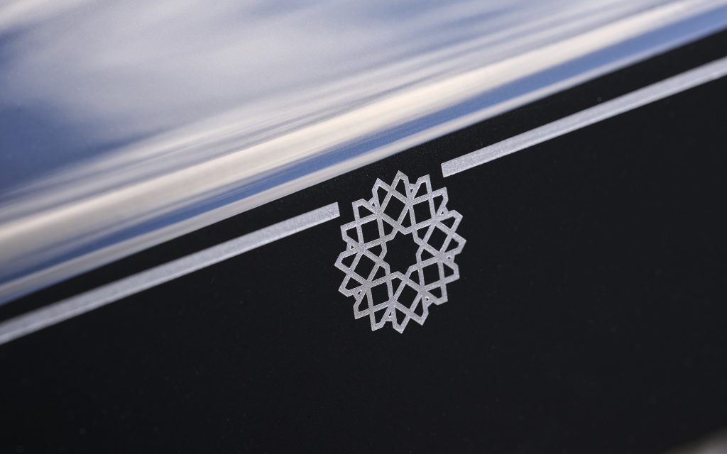 The cabin is finished in Selby Grey and Black leather with Black piping and carpets. Mashrabiya motifs are embroidered into the front and rear headrests. Starlight Doors trimmed with Selby Grey piping and Black contrast stitching extend the atmosphere of quiet drama. Illuminated treadplates echo a cross-section of the bonnet engraving, reinforcing the theme at every point of entry.