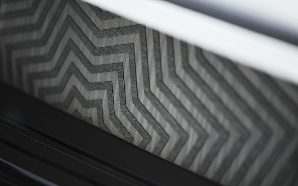 The Gallery, which spans the width of the fascia, houses an intricate marquetry artwork crafted from Blackwood and Black Bolivar wood. Its geometric pattern mirrors the bonnet engraving, creating continuity between exterior and interior.