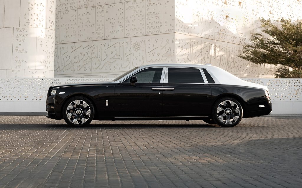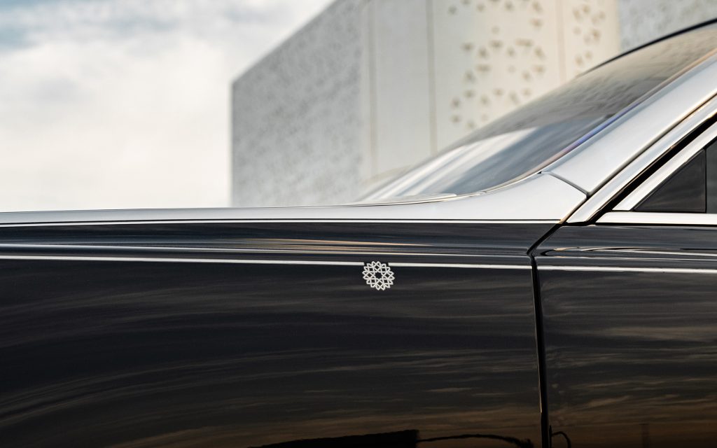 Phantom Arabesque is finished in a two-tone Bespoke scheme: Diamond Black for the body and Silver for the upper surfaces. A single hand-painted coachline in matching Silver is elevated with a mashrabiya motif. The illuminated Pantheon grille, Dark Chrome surround and uplit Spirit of Ecstasy complete the exterior composition, along with 22-inch part-polished wheels.