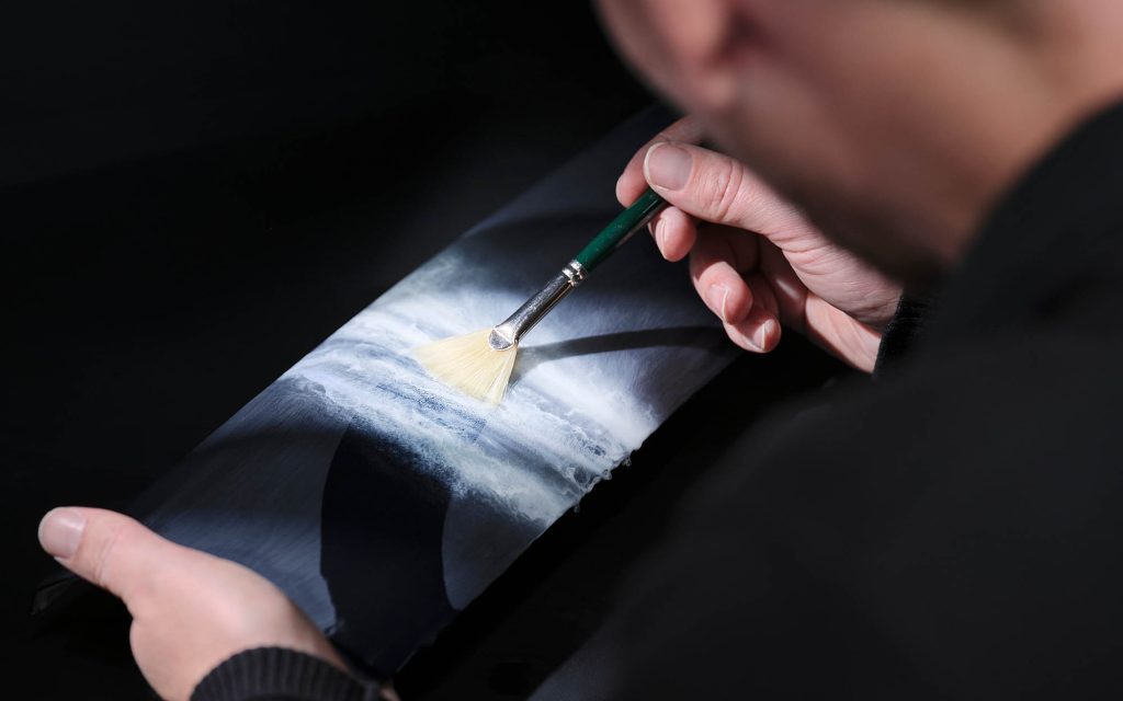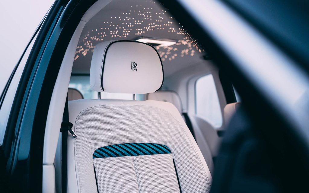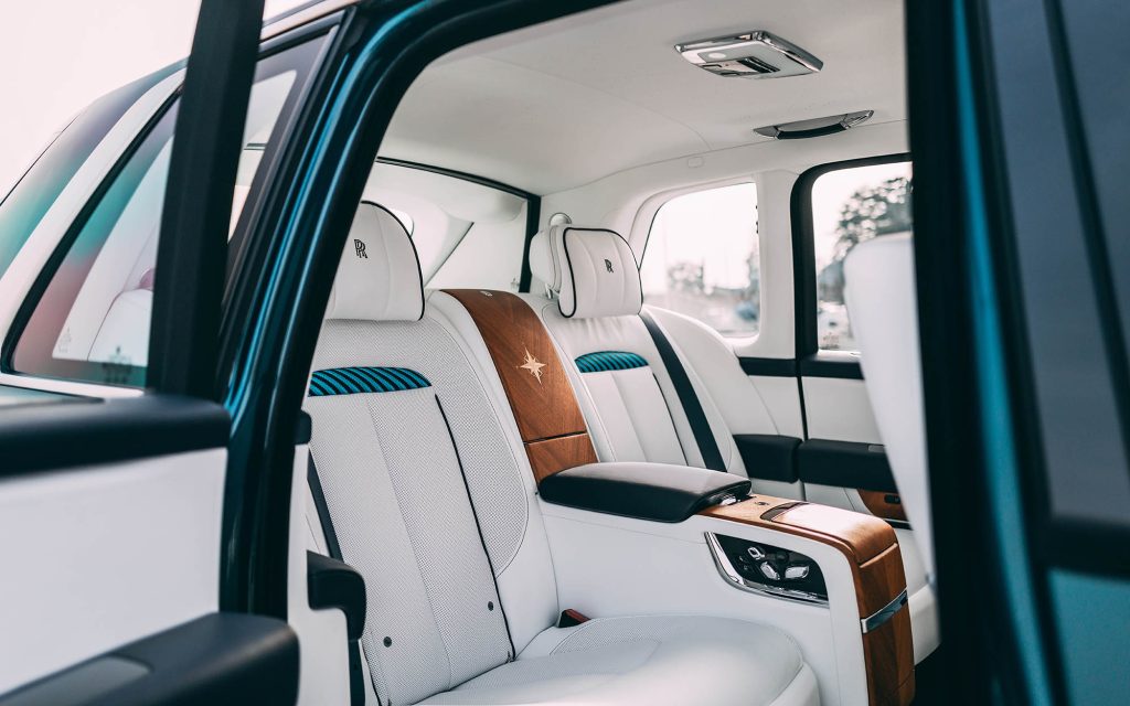 Above, each Cullinan features a unique Starlight Headliner mapped to Mediterranean wind patterns, using fiber-optic lighting to create subtle motion across the roofline. Exterior treatments vary by theme, with finishes ranging from lighter blues to darker metallic tones, each paired with hand-painted compass graphics and contrasting coachlines.