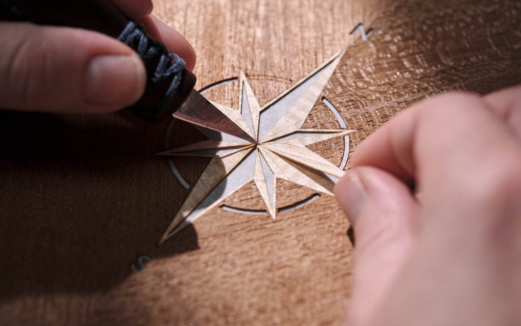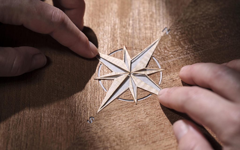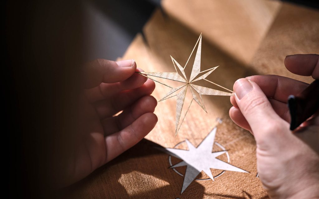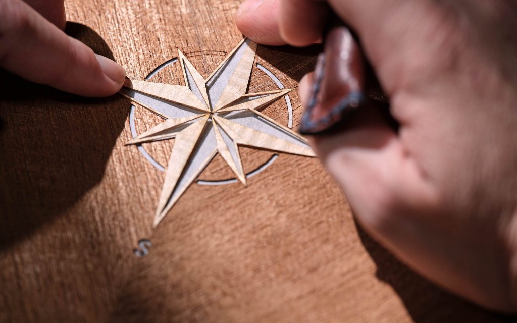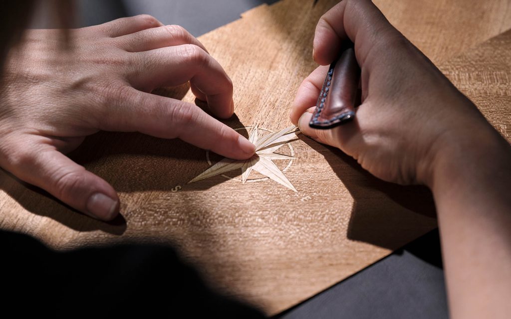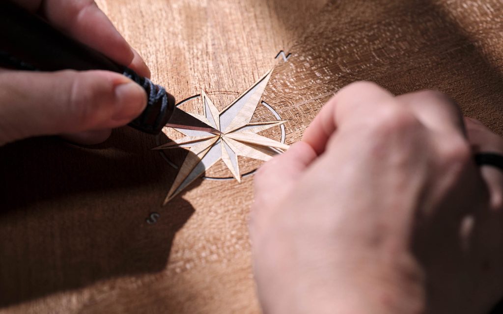 Material selection reinforces the nautical connection. Open-pore teak—commonly used in yacht decking—appears throughout the cabin, while a marquetry compass motif constructed from more than 40 individual veneer pieces anchors the rear interior. The seats introduce a rope-inspired stitching pattern, translating marine rigging into textile form, and illuminated treadplates carry the motif further.